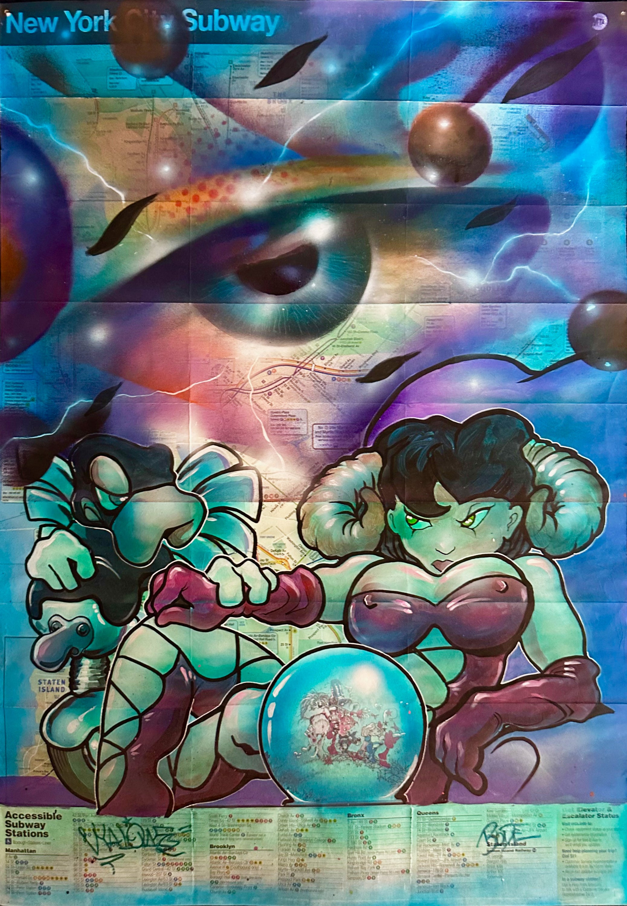 BODĒ X VYAL- Titled "Da Wicked Bitch From Da Lizard of OZ" Aerosol, acrylics and mixed media on NYC map, Measures 23" x32" Signed by both Mark Bode and VYAL from 2022.