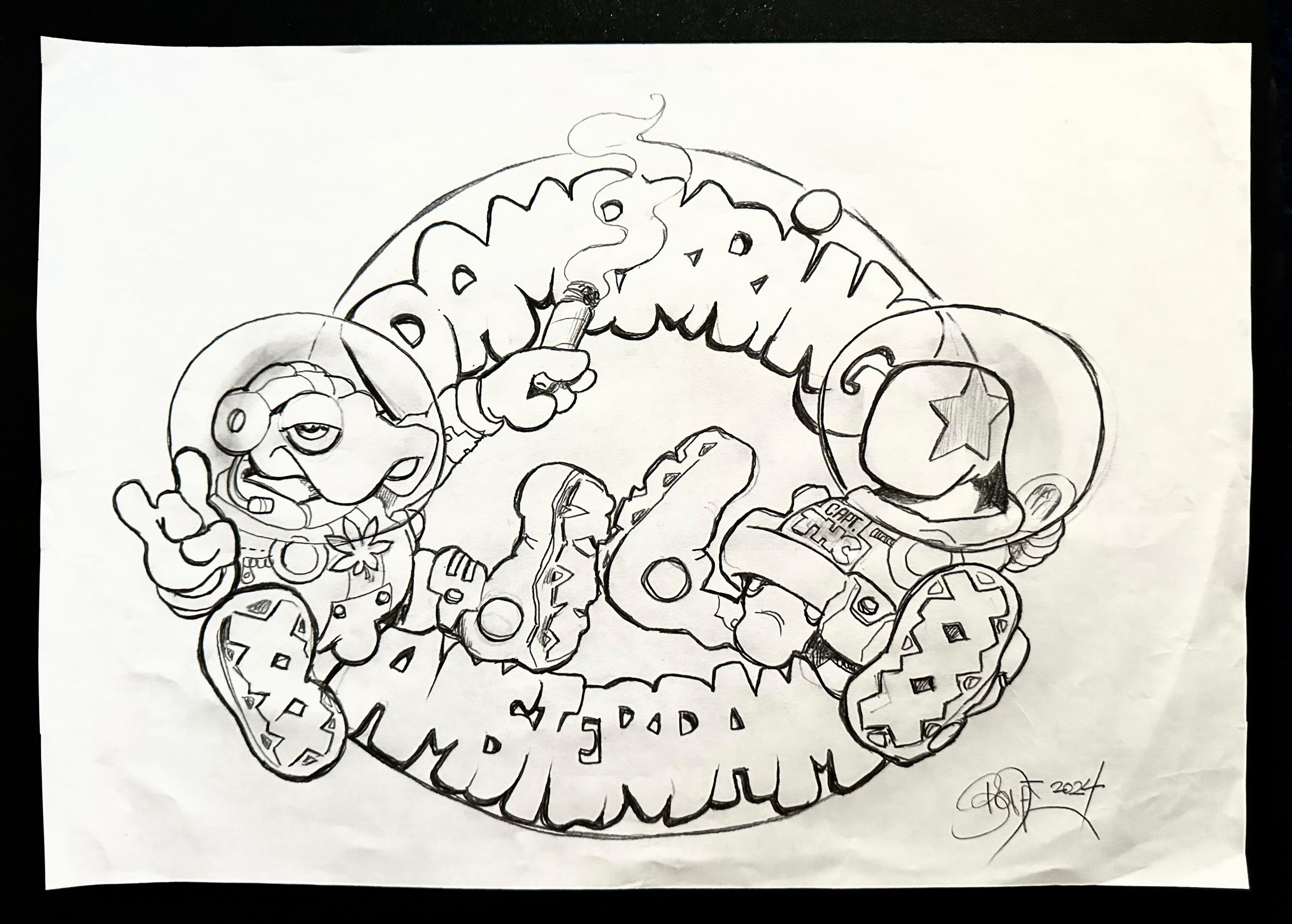 Mark Bode- Titled "Dampkring Amsterdam Hoodie Design" Graphite on paper, Measures 16" x 11" Inches. A Hoodie design commissioned for the famous Dampkring coffee shop in Amsterdam . Signed and dated by Mark Bode from 2024.