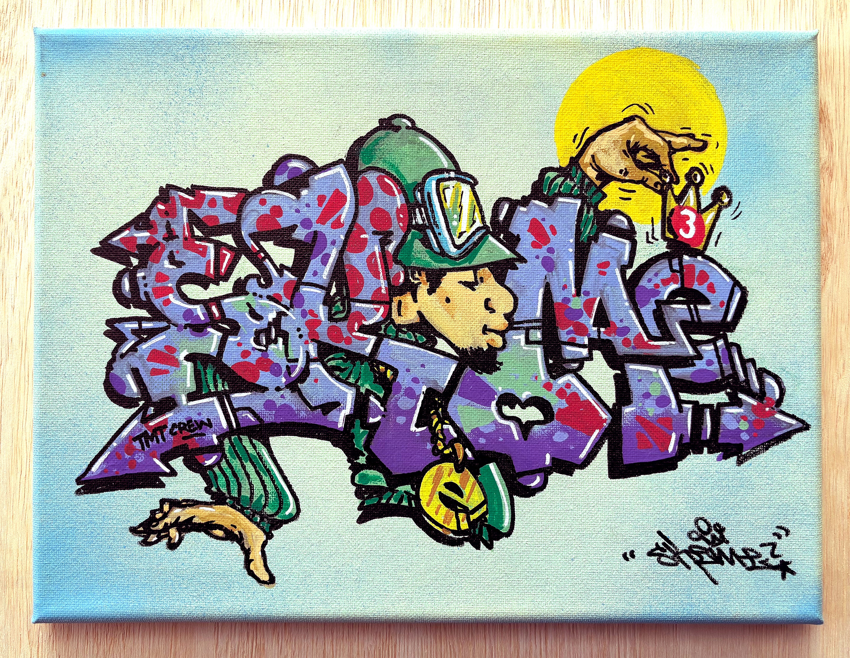 SKEME - "Gently"  Acrylics and paint marker on canvas, measures 12" x 9. signed Verso, from 2025"