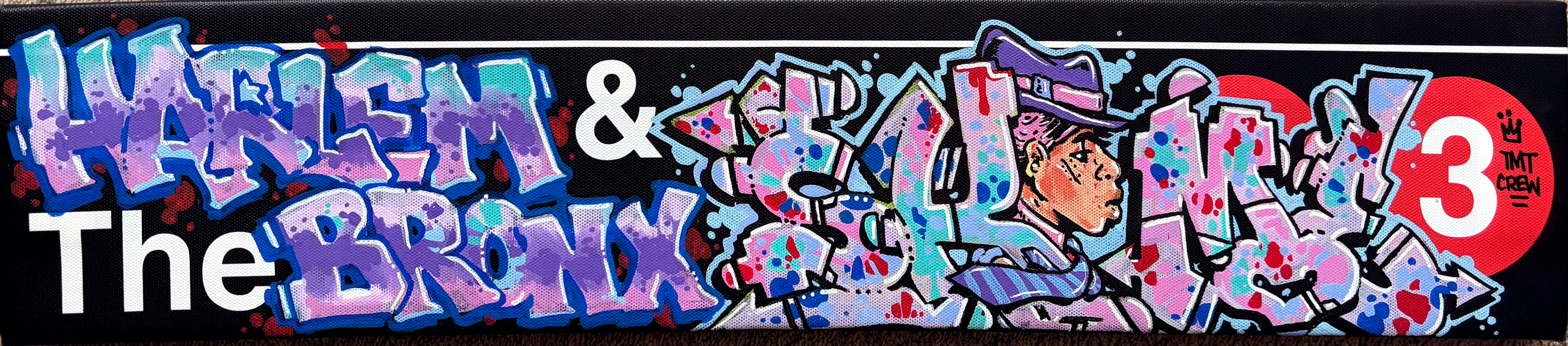 SKEME - "Strictly Business"  Acrylics and paint marker on canvas stretched on wood. A replica of the Uptown & The Bronx Subway sign, measures 5" x 24" x 3/4" inches. from 2026. Comes ready to hang.