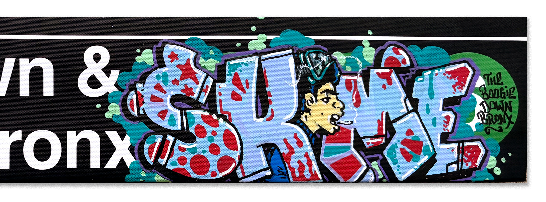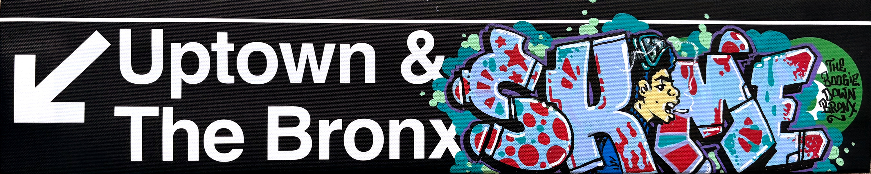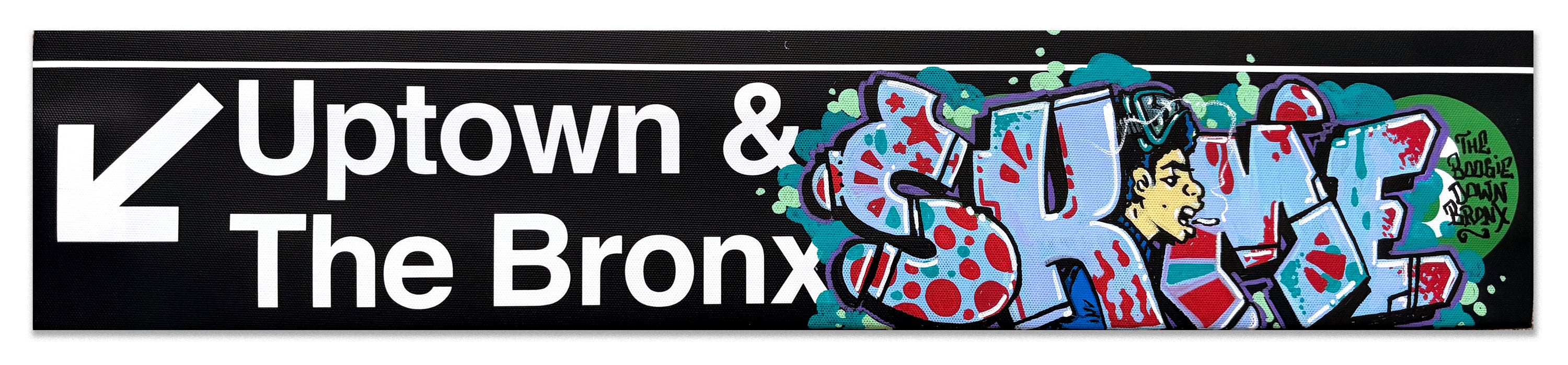 SKEME - "The Boogie Down"  Acrylics and paint marker on canvas stretched on wood. A replica of the Uptown & The Bronx Subway sign, measures 5" x 24" x 3/4" inches. from 2026. Comes ready to hang.