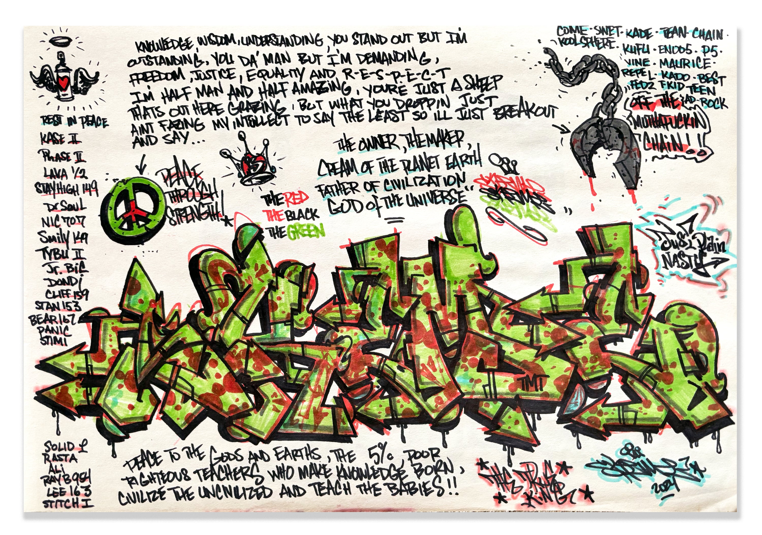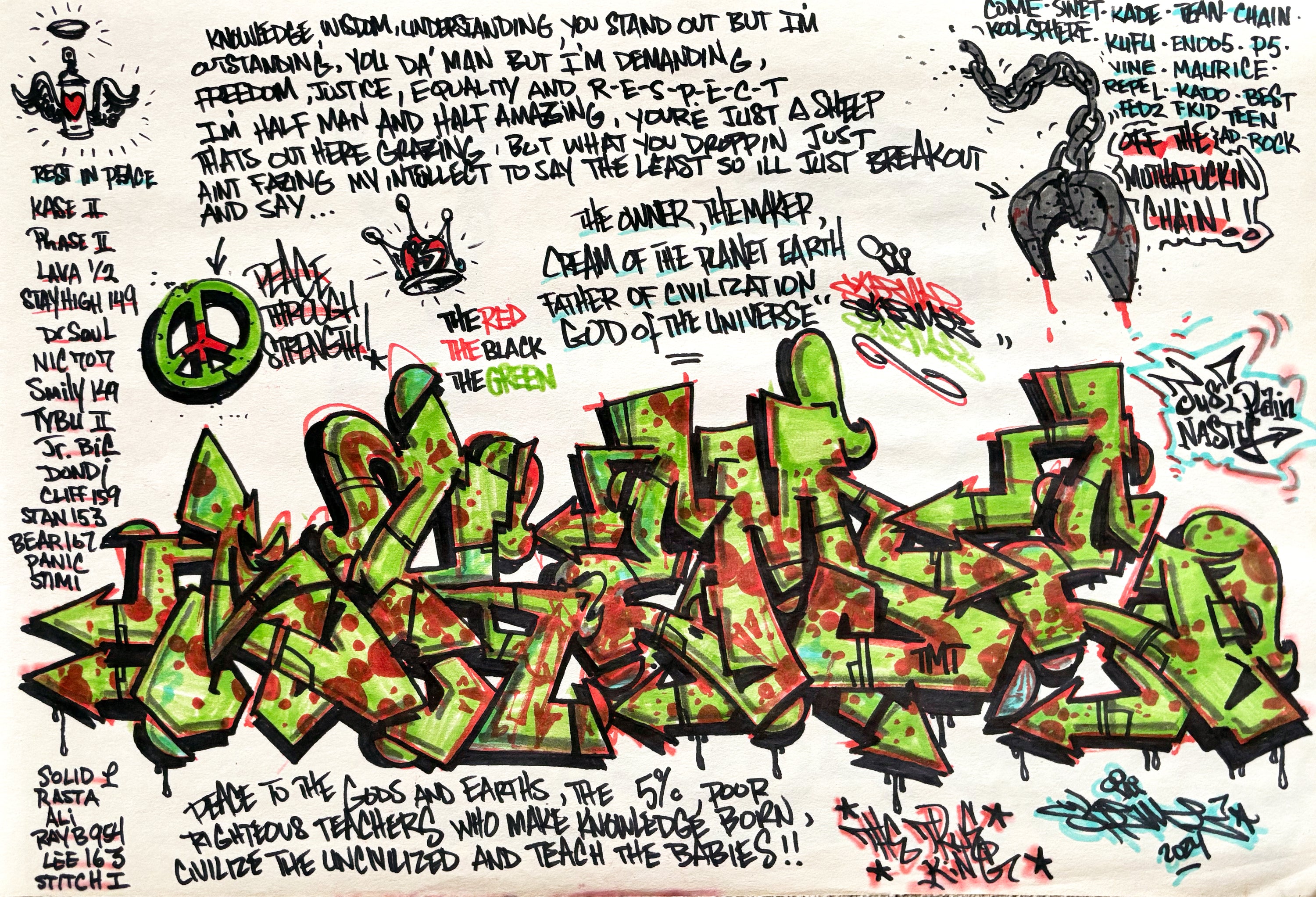 Skeme also enjoyed membership and affiliation with some of the top writing crews of the day to include: INDS, TDS, TMT, TNT, TED, and 3YB. In early 82', Skeme, along with his mother, was featured in the pioneering documentary, “Style Wars”, produced by Henry Chalfant and Tony Silvers, which showcased Graff and B-Boying, two of Hip Hop's primary elements. Although this documentary practically made Skeme a household name, he considers his crowning achievements as the time Graff legend and pioneer Phase2 (INDS Founder) sought him out and enlisted him to assist in pulling off the famous “Tuff City” car and most notably piecing with his heroes Tean and Kade, Chain3, Kool131, and Part1 and ultimately gaining membership in the "The Magnificent Team" (TMT Crew). In the tradition of those greats, as well as Riff170, Skeme considers himself a letter purist with a "minor" in drawing characters and caricatures.