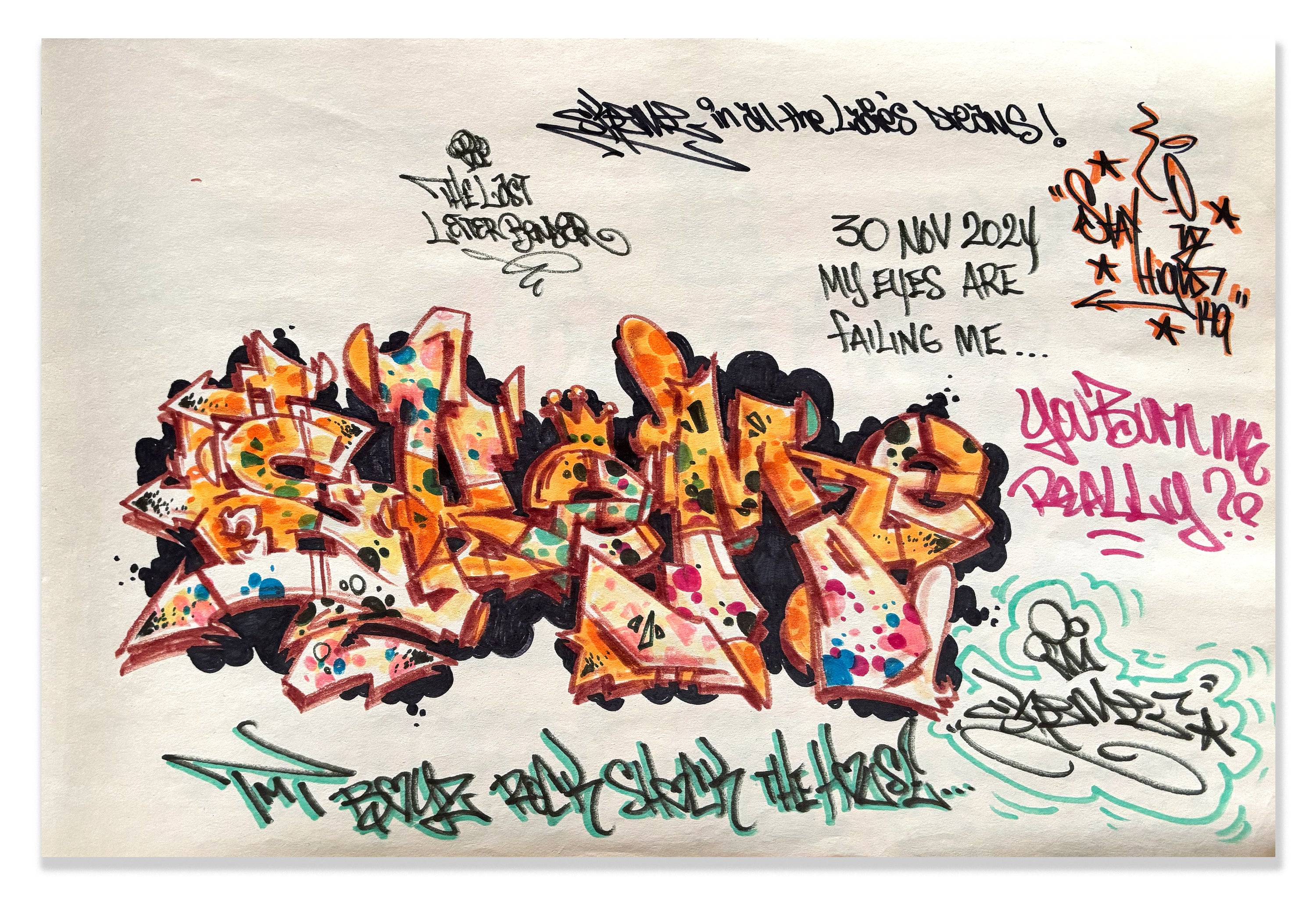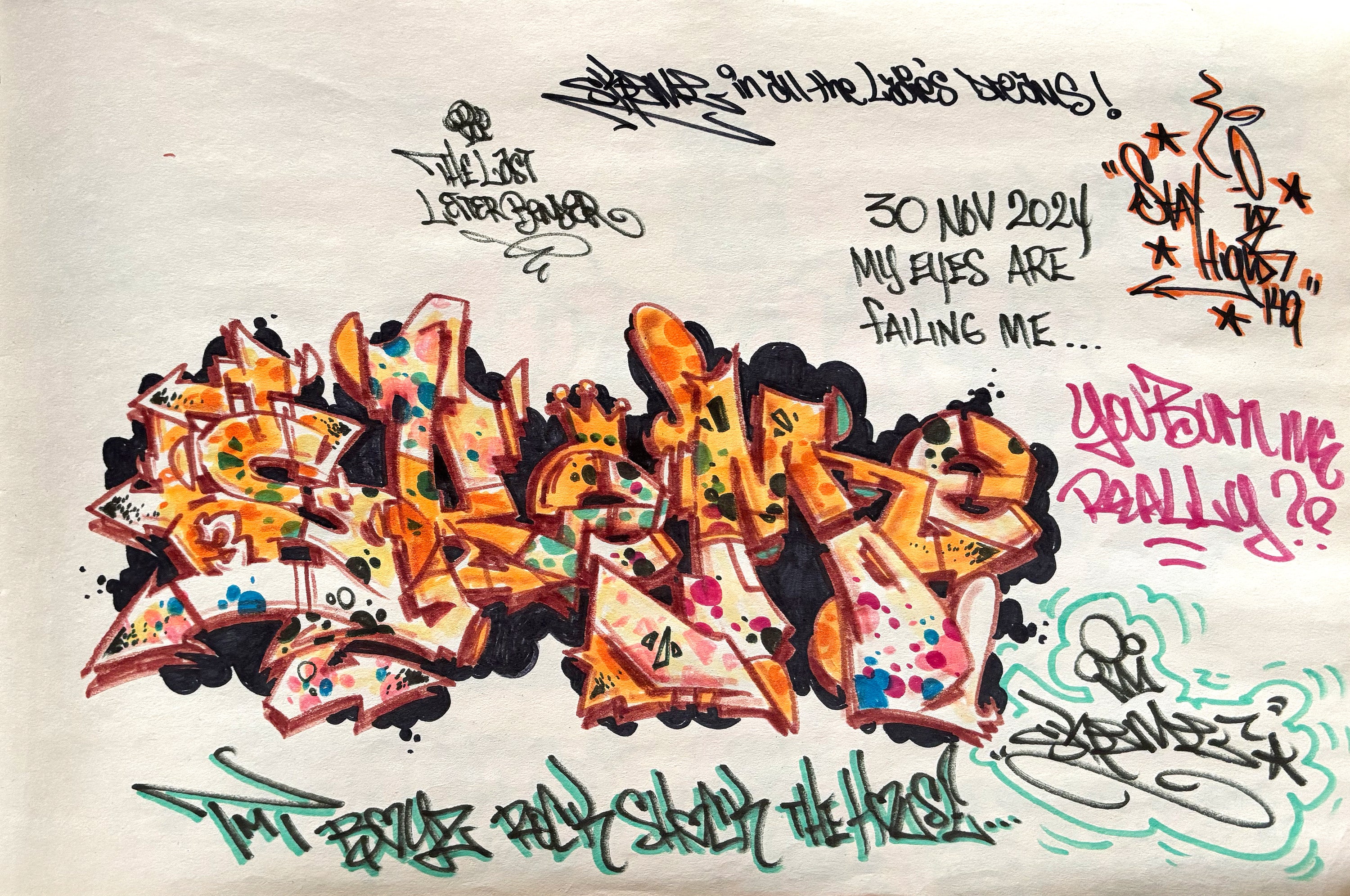 SKEME- "Last Letter Bender" Drawing. Marker on News print paper. Measures 12" x 18" inches  . Signed in composition as show.