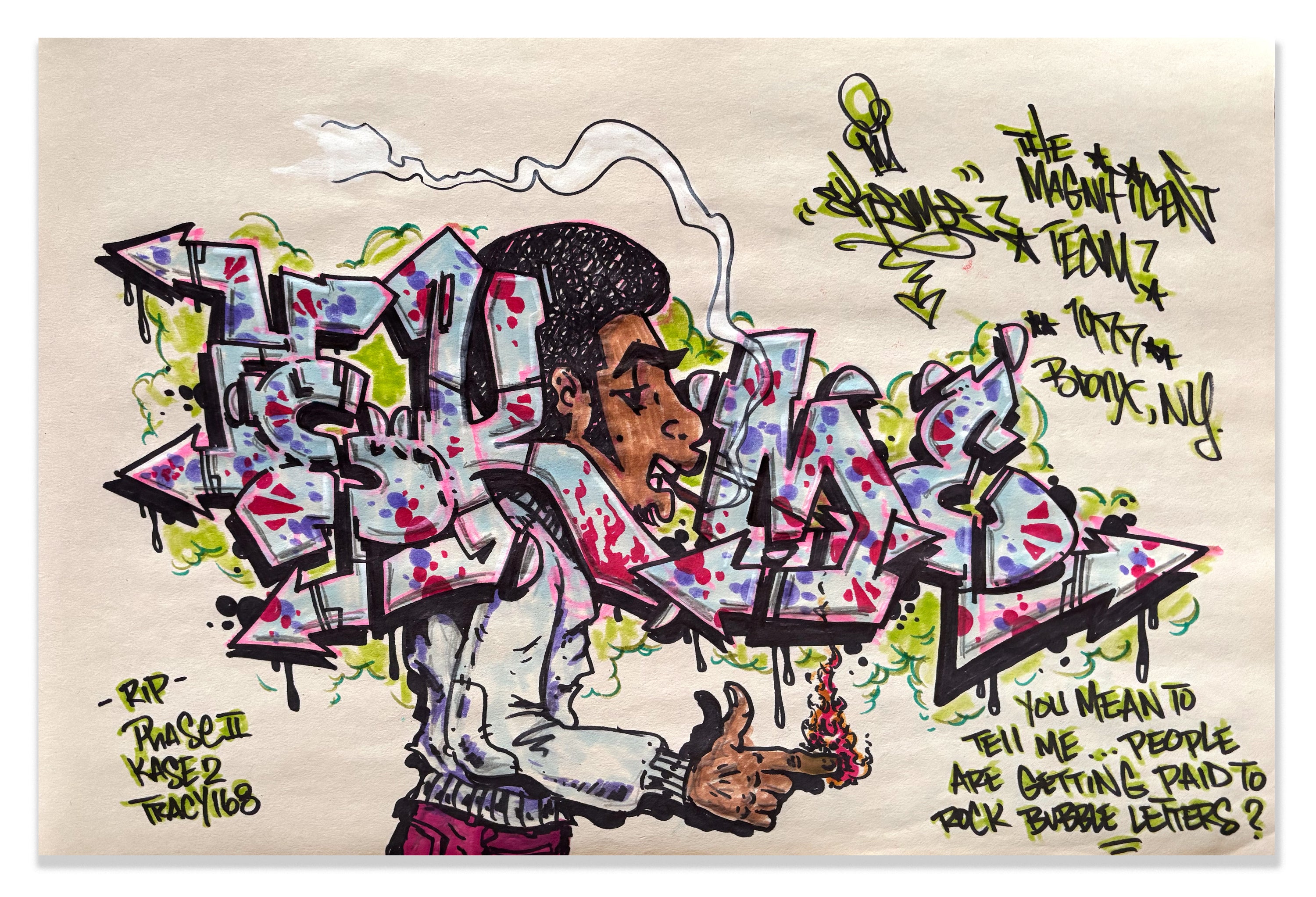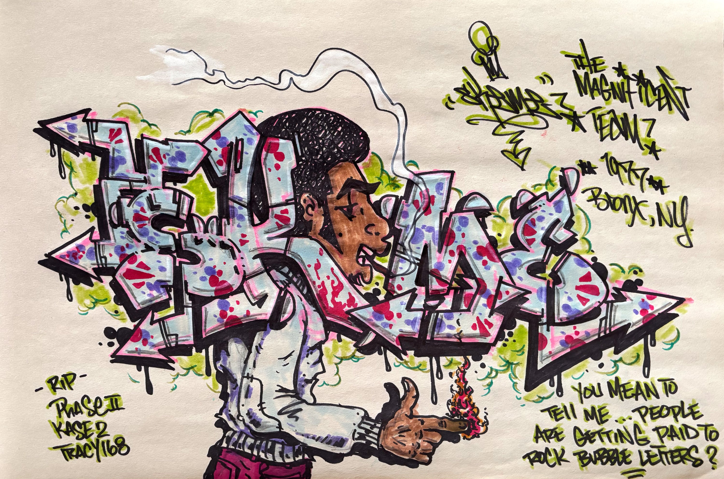 Skeme also enjoyed membership and affiliation with some of the top writing crews of the day to include: INDS, TDS, TMT, TNT, TED, and 3YB. In early 82', Skeme, along with his mother, was featured in the pioneering documentary, “Style Wars”, produced by Henry Chalfant and Tony Silvers, which showcased Graff and B-Boying, two of Hip Hop's primary elements. Although this documentary practically made Skeme a household name, he considers his crowning achievements as the time Graff legend and pioneer Phase2 (INDS Founder) sought him out and enlisted him to assist in pulling off the famous “Tuff City” car and most notably piecing with his heroes Tean and Kade, Chain3, Kool131, and Part1 and ultimately gaining membership in the "The Magnificent Team" (TMT Crew). In the tradition of those greats, as well as Riff170, Skeme considers himself a letter purist with a "minor" in drawing characters and caricatures.