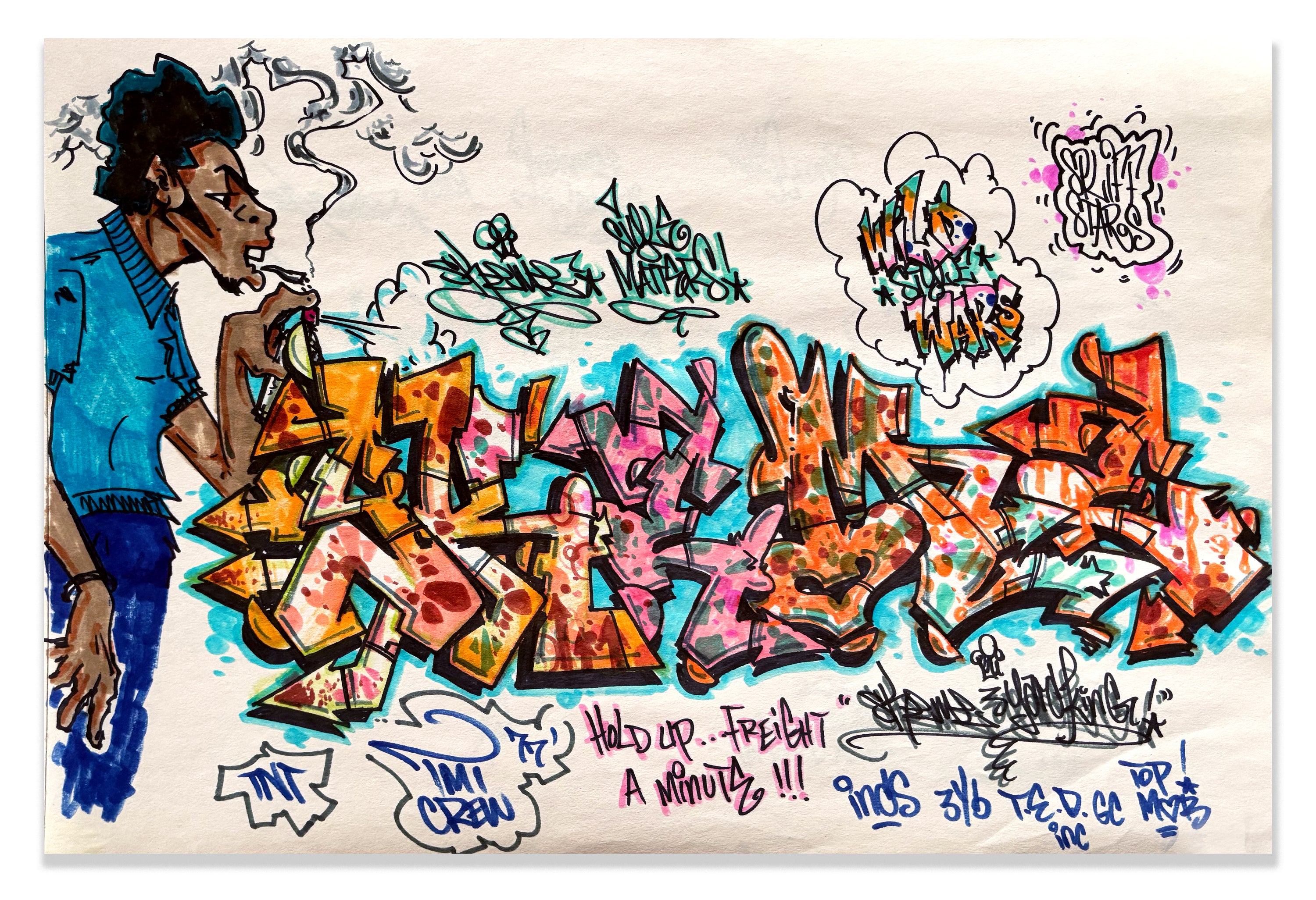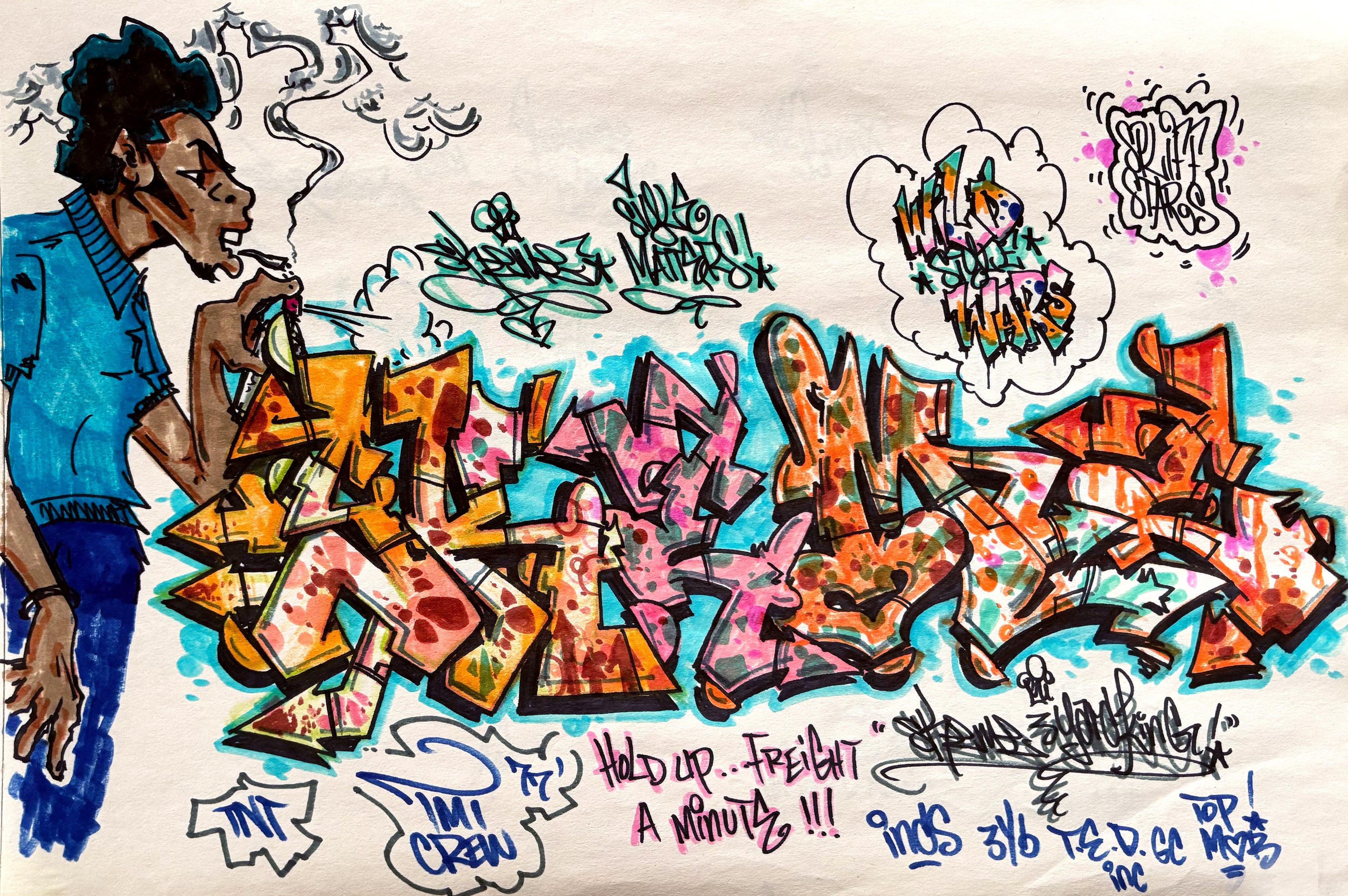 Skeme also enjoyed membership and affiliation with some of the top writing crews of the day to include: INDS, TDS, TMT, TNT, TED, and 3YB. In early 82', Skeme, along with his mother, was featured in the pioneering documentary, “Style Wars”, produced by Henry Chalfant and Tony Silvers, which showcased Graff and B-Boying, two of Hip Hop's primary elements. Although this documentary practically made Skeme a household name, he considers his crowning achievements as the time Graff legend and pioneer Phase2 (INDS Founder) sought him out and enlisted him to assist in pulling off the famous “Tuff City” car and most notably piecing with his heroes Tean and Kade, Chain3, Kool131, and Part1 and ultimately gaining membership in the "The Magnificent Team" (TMT Crew). In the tradition of those greats, as well as Riff170, Skeme considers himself a letter purist with a "minor" in drawing characters and caricatures.