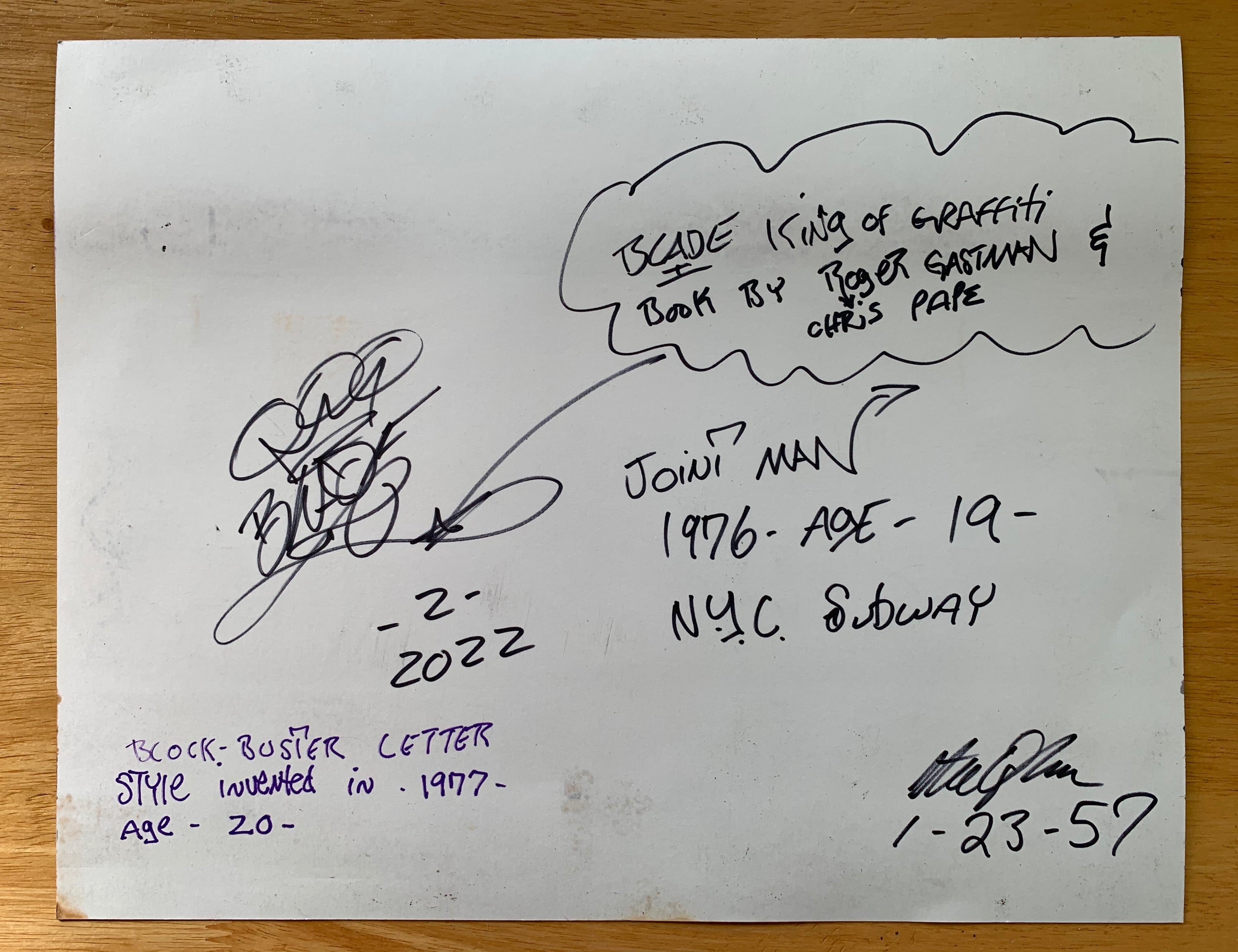 At the forefront of the subway graffiti art movement in the early 70s, Blade's work is not only recognized as significantly influential, but his lengthy career as a professional artist has warranted worldwide notoriety & fame. Painting over 5000 trains & evolving to new levels of subway & canvas graffiti Blade has had exhibitions at the Whitney museum(2000) Cleveland's Rock n Roll Hall of Fame (2000) A 1991 show at The Musse National De Monuments Francais (Paris France) numerous shows at the Groniger Museum, and dozens of shows in Europe & Asia.On October 28,1994,Blade was invited to the Groniger museum to meet the Queen of England, as she was attending the prestigious institustion's re-opening.