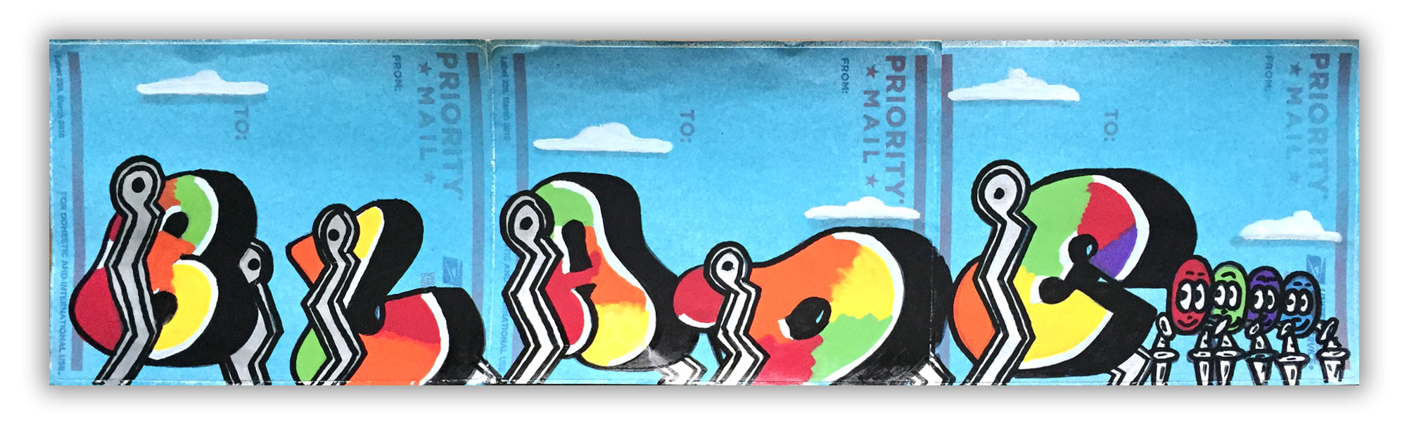BLADE - "Swinging Letters" USPS labels. BLADE has taken 3 USPS sticker labels, taped them together and hand drawing in marker arguably his most famous train image."Swinging LettersThis little gem measures 16" x 4.5" inches. Signed, date and titled verso in marker by BLADE.