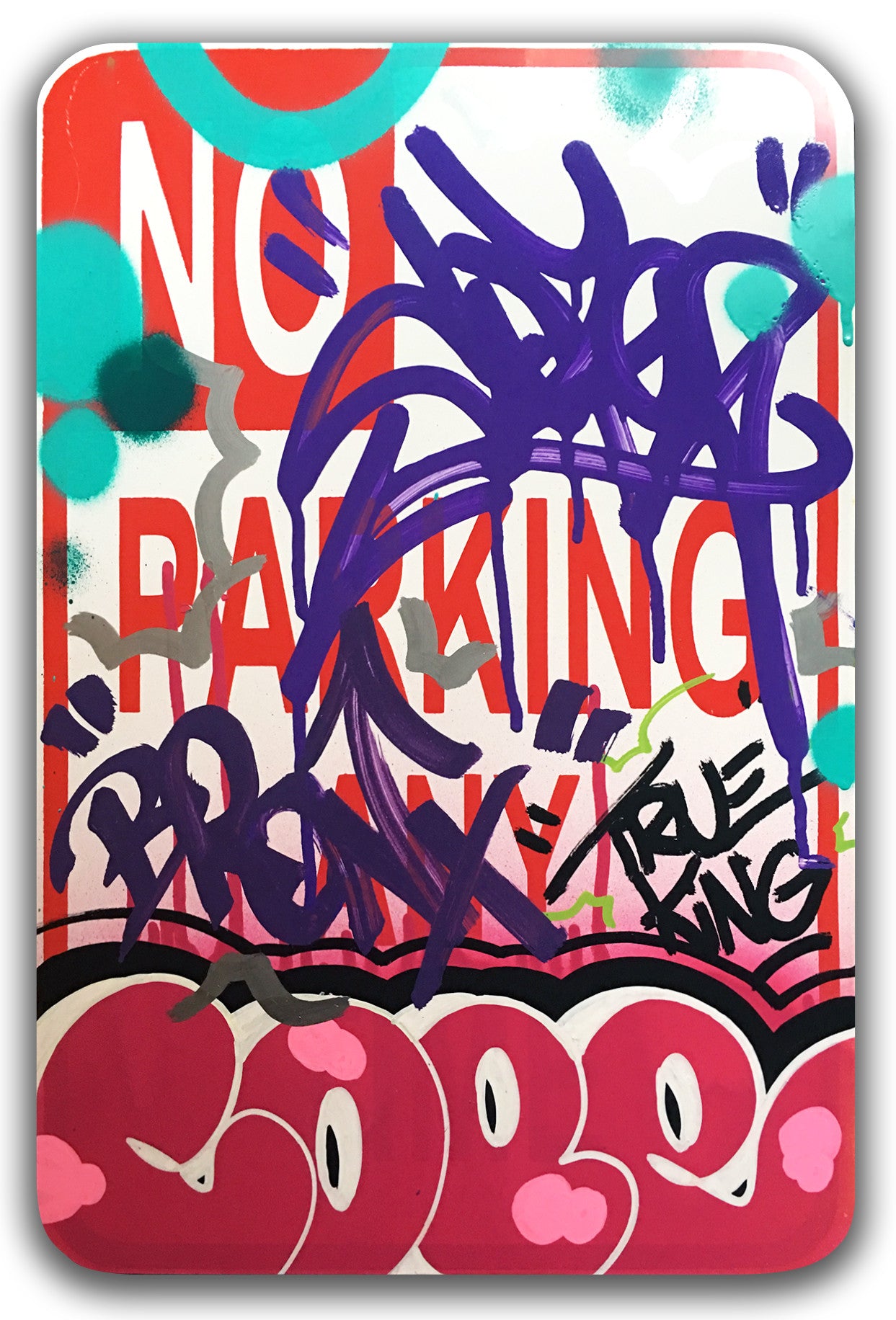 COPE 2 - "Red Classic Bubble" No Parking Sign. Acrylic and paint Marker on Aluminum an official No Parking sign. Measures 12" x 18 inches, from 2017.