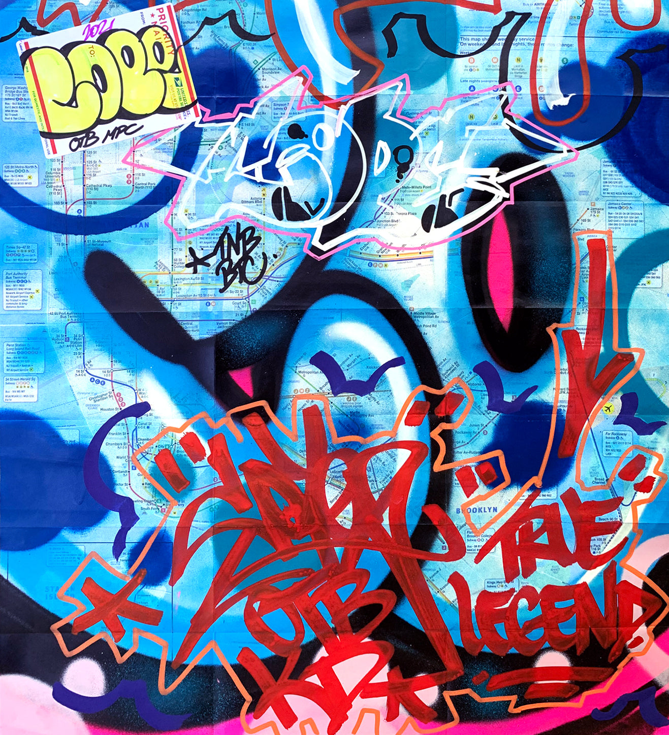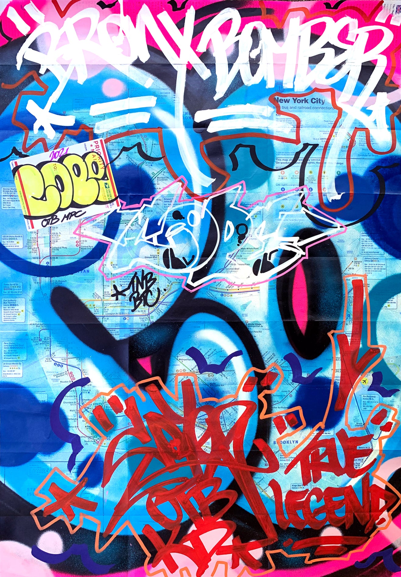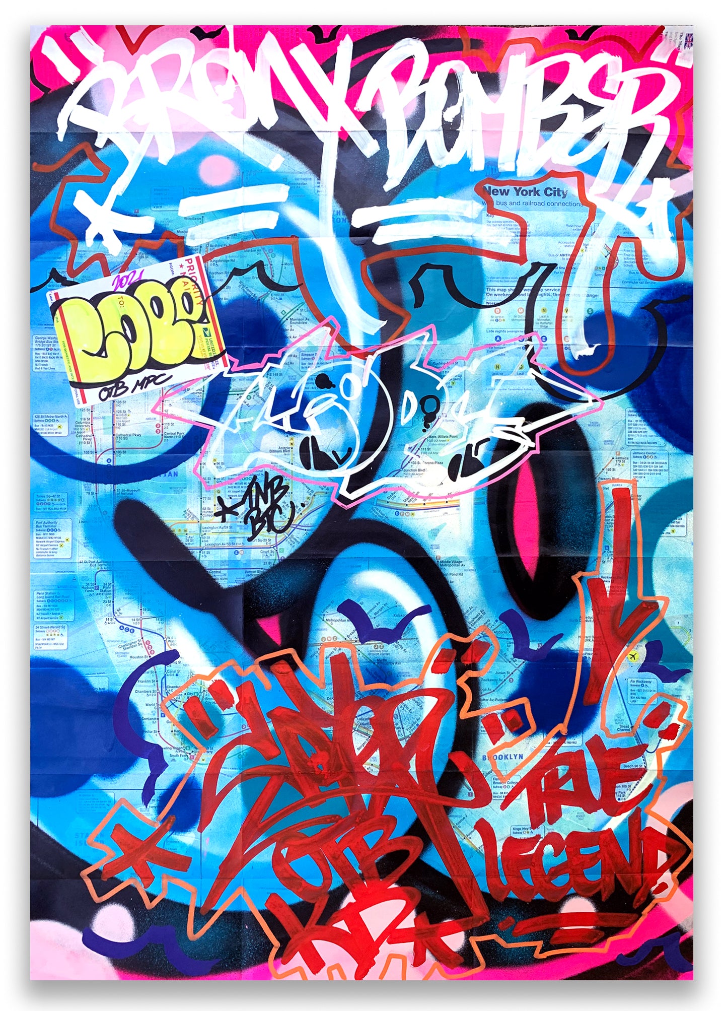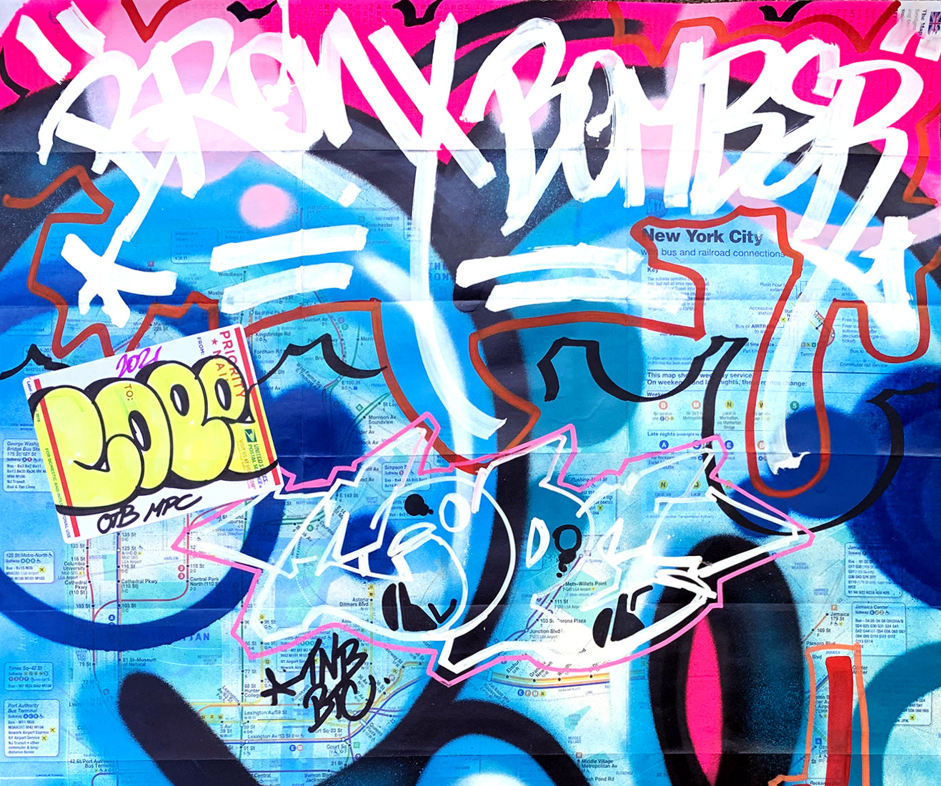 Cope- :Bronx Legend" Map Painting. Acrylic, Marker, sticker and Spray on  NYC Metro Map, 2021. Measures 23"x 32". Signed.